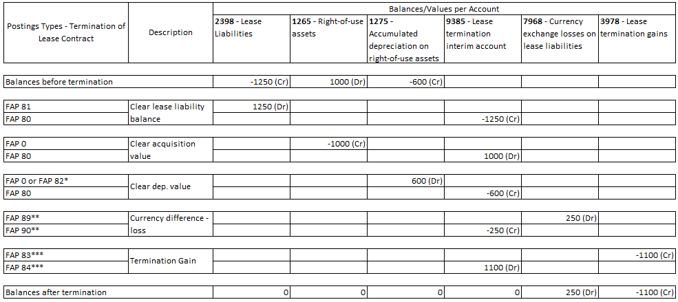 postings relating to the termination/acquisition of lease asset will be