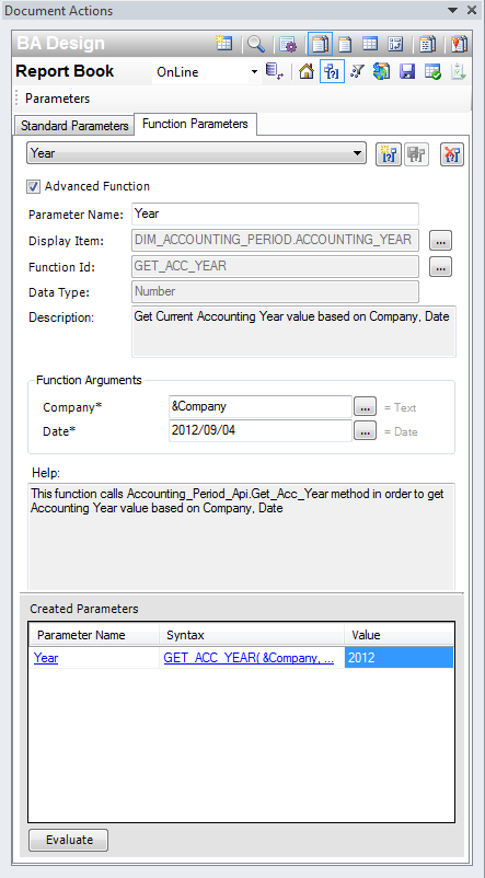 - Select Function Id GET_ACC_YEAR from the function id List of Values. The Function Argument section will be updated with arguments Company and Date.