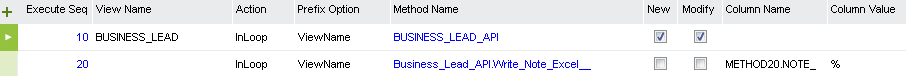 Create the job header as usual and set the procedure name to EXCEL_MIGRATION. Then add two methods to in the Method List tab. One for the Base LU View (e.g. Business_Lead), and another to set the CLOB field (e.g Note) using a procedure E.g. Write_Note_Excel__. This method is similar to procedure exist for most LUs with CLOB fields which will be called Write_[Fieldname]__ (e.g. Write_Note__). The difference is that the method's arguments should be VARCHAR2 instead of ROWID. Then provide values for Column Name and Column Value for the method. This is to ensure that the Note field has a value.