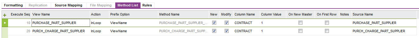 Create the job header as usual and set the procedure name to EXCEL_MIGRATION. Then add two methods to in the Method List tab. One for the Base LU View (e.g. Supplier_Info), and another for the Custom Fields View (_CFV) . The Method Name for the Custom Fields should have the method _CFP.CF_NEW__. Note the Column Name and Column Value values given for the method. This is to ensure that method 20 is executed when DUMMY column has values. We will create this column in the Source Mapping tab later.