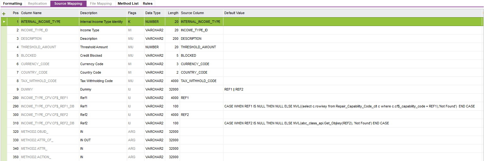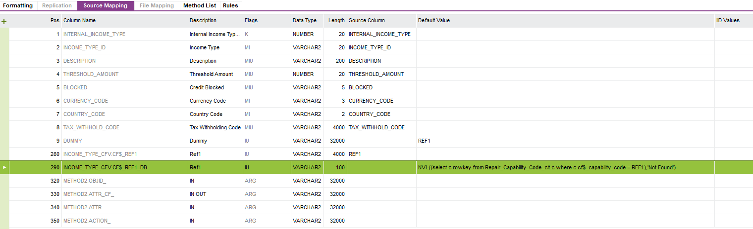 Now go to the source mapping tab and enter values for the Source Column. If you have entered a View Name for the Migration Job Header when creating the job, most of the Source Columns would have been filled automatically. You might have the same column names coming from _CFV view as well. Remove them as they are not required but keep the Custom Field columns. Make sure that you have entered Source Column values for the Custom Fields. Create the column DUMMY mentioned before which acts as the condition for executing method 20. For the Default Value for the DUMMY column add the Custom Field's Source Column name. If you have more than one Custom Field, concatenate them together.