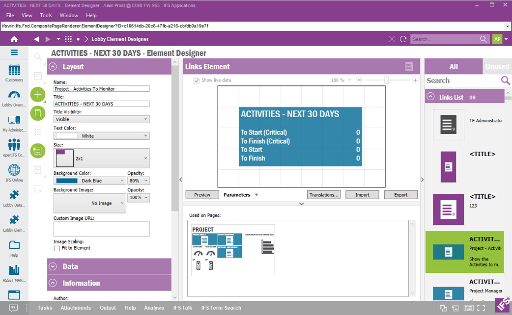 If the selected element is used on a Page this Page will be shown here. Navigation to the Page is possible by double clicking the Page.