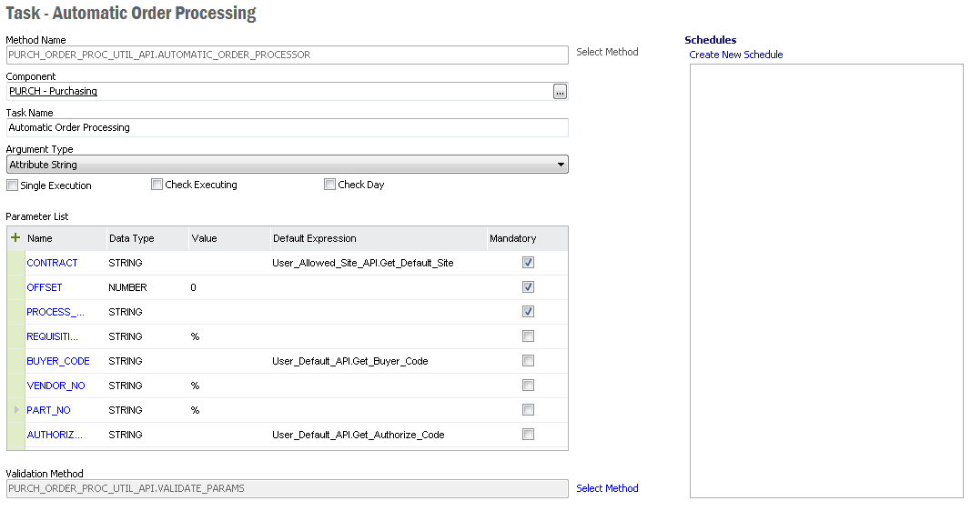 | Validation Method | Method that is used to validate the Scheduled tasks parameters. The method must take one parameter that is an IFS Message. |