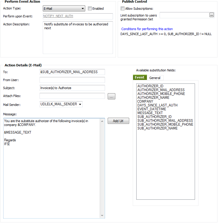Action Type and Perform upon Event are mandatory. Besides that the Event Actions functionality must be turned on (this you can see in the Event Actions start page) and that IFS Connect must be configured to handle events each event action can be turned on and off. The event action must thus be enabled in order to be performed. When the Event action is enabled the Event is also enabled.